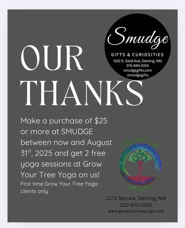 Grow You Tree Yoga to offer an amazing deal! Purchase $25 or more at SMUDGE and receive TWO free yoga sessions at Grow Your Tree Yoga. Contact SMUDGE for more details.