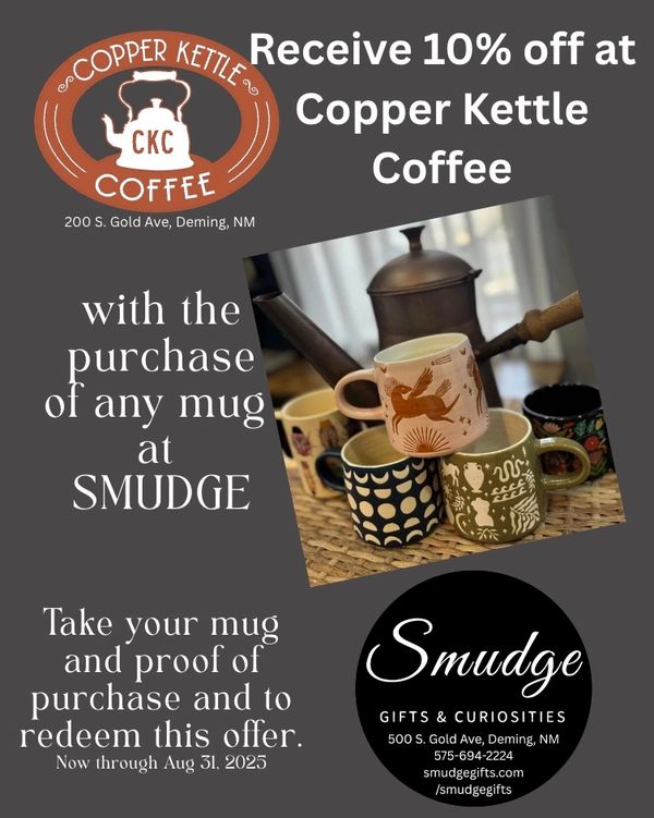 Working with our friends at Copper Kettle Coffee to get you a mug and something to put in it. Take any mug you purchase at SMUDGE to Copper Kettle Coffee and they will fill it for 10% off. Don't forget to take proof of purchase when you go and tell them SMUDGE sent you!